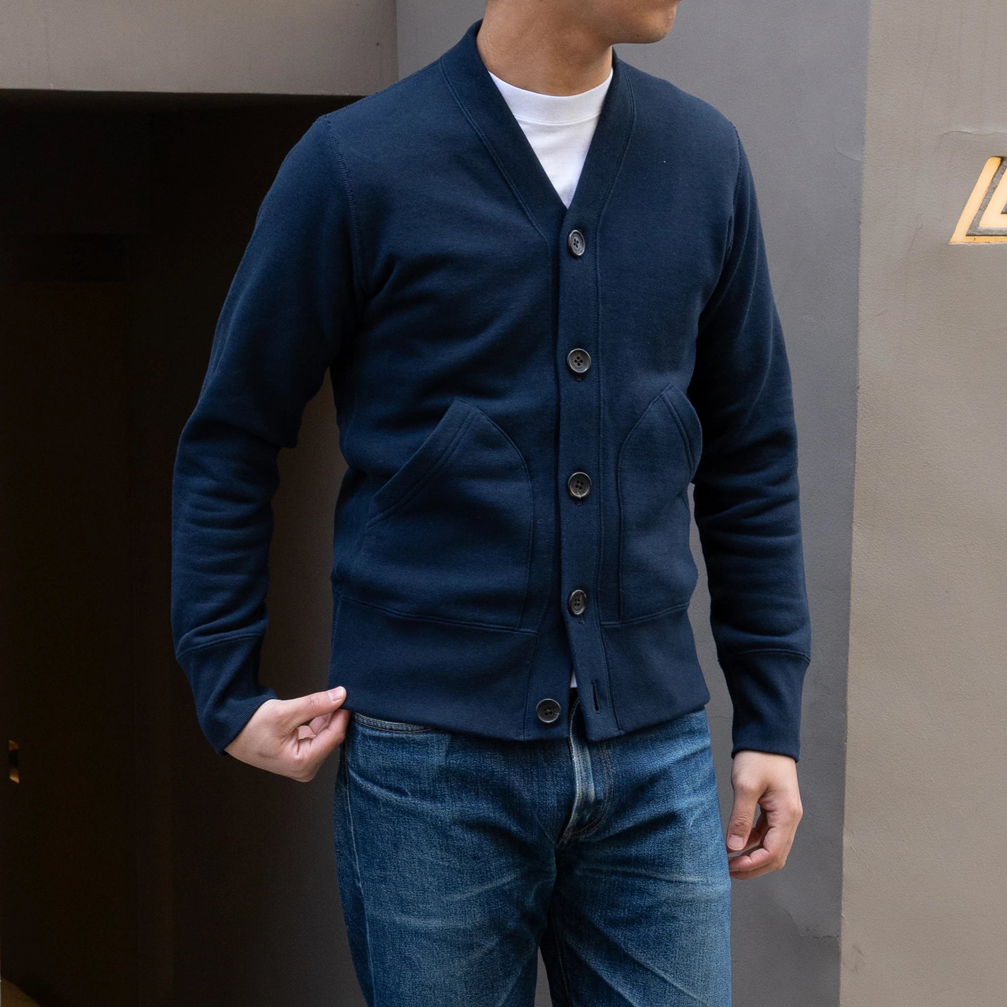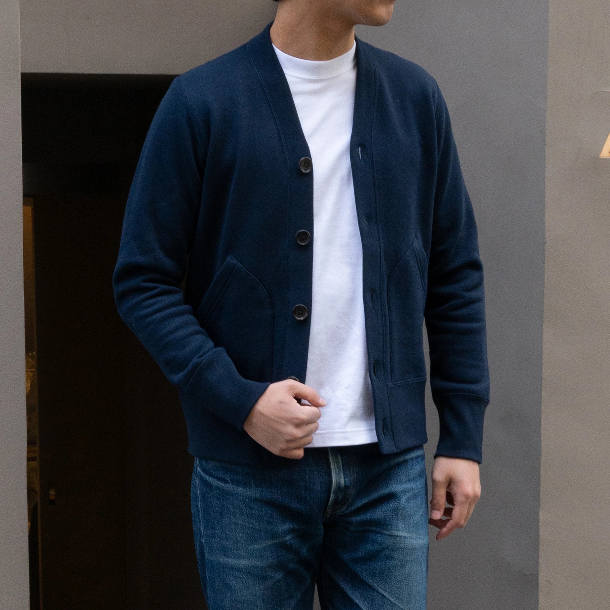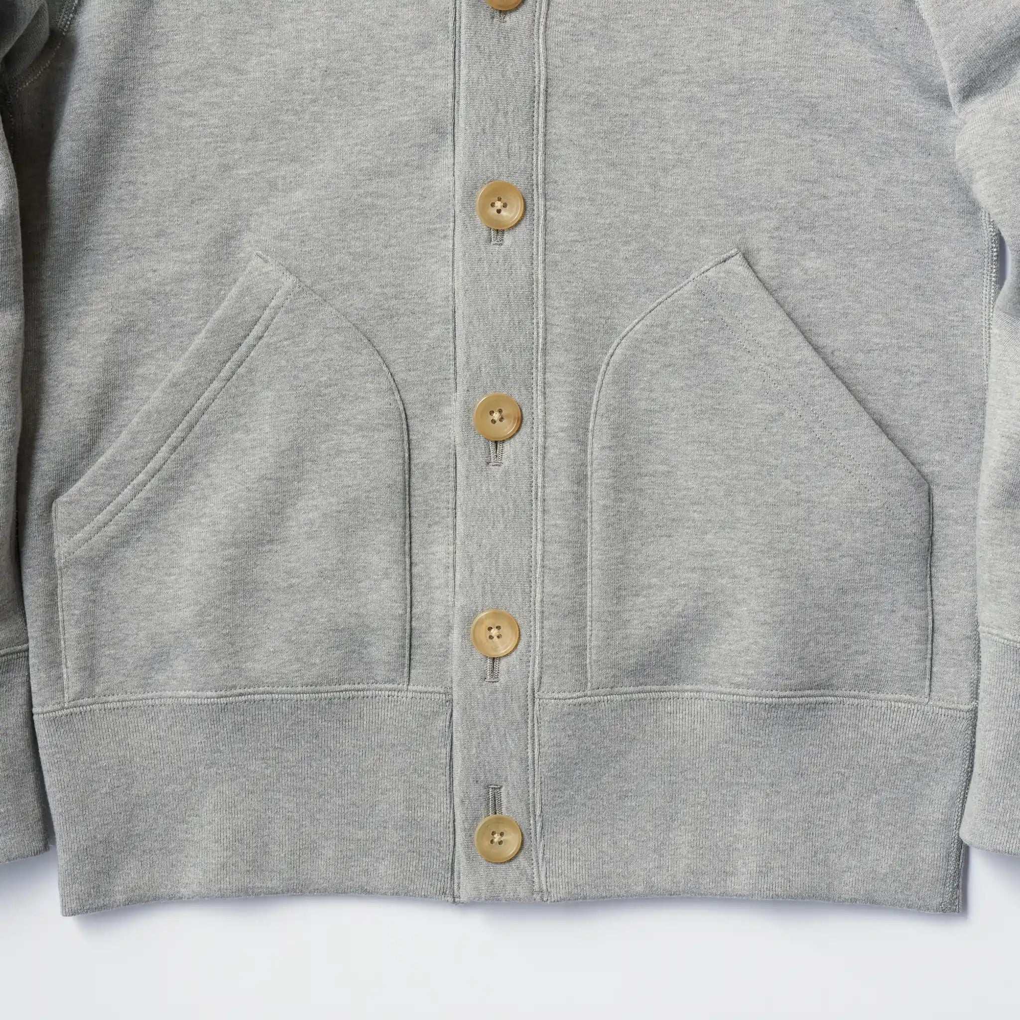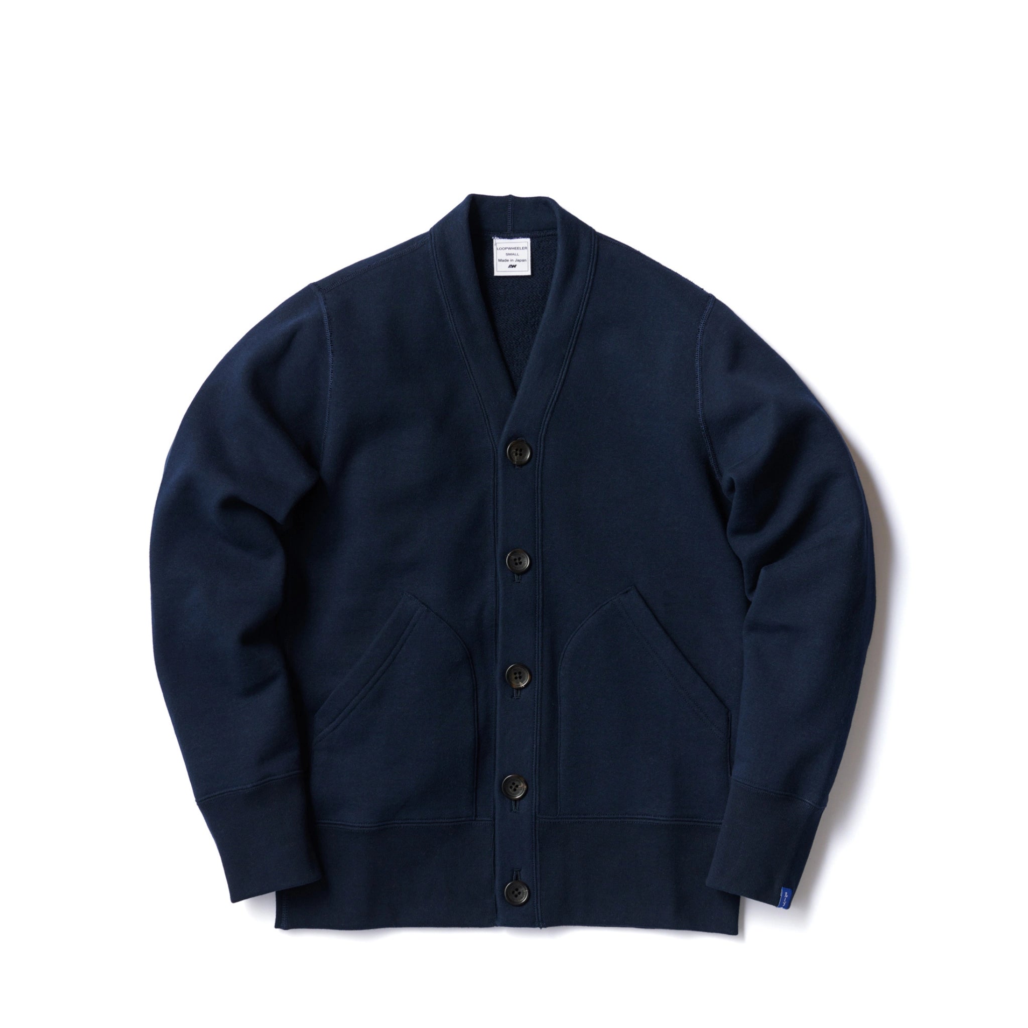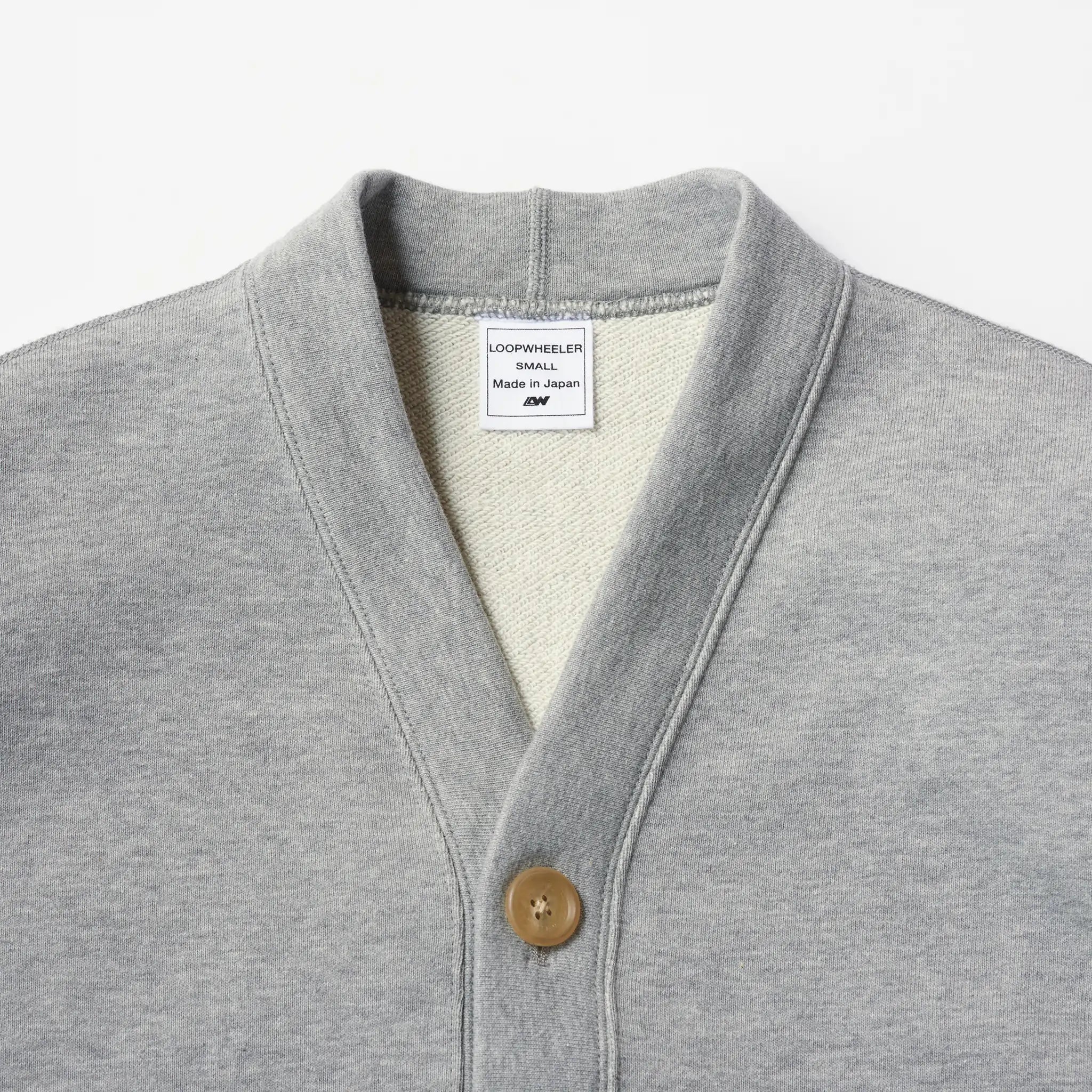 LOOPWHEELER刻印入りボタンを使用しています。シルエットを微調整し、インナーにシャツを合わせたスタイリングを想定したサイズ感となっています。スウェット 素材でありながらカジュアル過ぎない印象が特徴で、